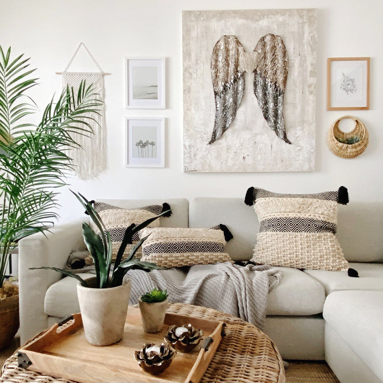 'Skopelos' Bohemian Black and Cream pillow. Mix and Match with textured boho throw pillows for extra charm in your sofa or bed room. Handmade in India, handwoven of 100% cotton with tassels. Please select the size before ordering.