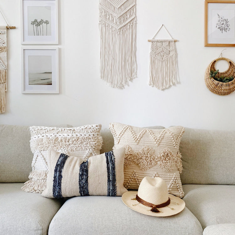 'Alonisos' Neutral Bohemian Pillow covers. Mix & Match with these playful neutral throw pillows cover and add some boho or farmhouse texture in your sofa or bed room. Handmade in India, crafted of 100% woven cotton. Available in various sizes, standard size pillow 20x20 inches and in large size sofa, bed or floor pillow 22x22 inches.