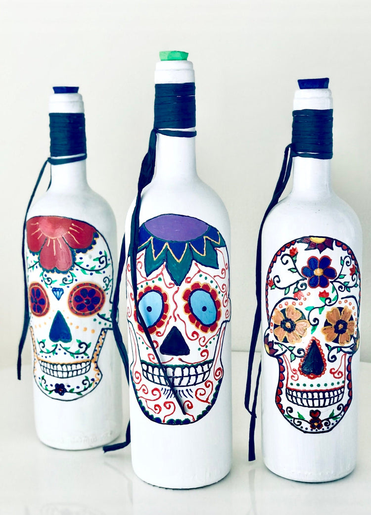 Hand painted wine bottles collection representing Dia de los Muertos, one of the biggest celebration in Mexico. All the bottles are hand-painted with acrylic using black or white background. Each piece is one of a kind, perfect for creating a spiritual corner or for a special gift occasion.