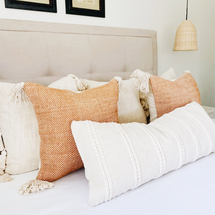 'Daphne' Bohemian Peach/Orange pillow. Mix & Match with textured boho throw pillows for extra charm in your sofa or bed room. Handmade in India, handwoven of cotton and wool with tassels.
